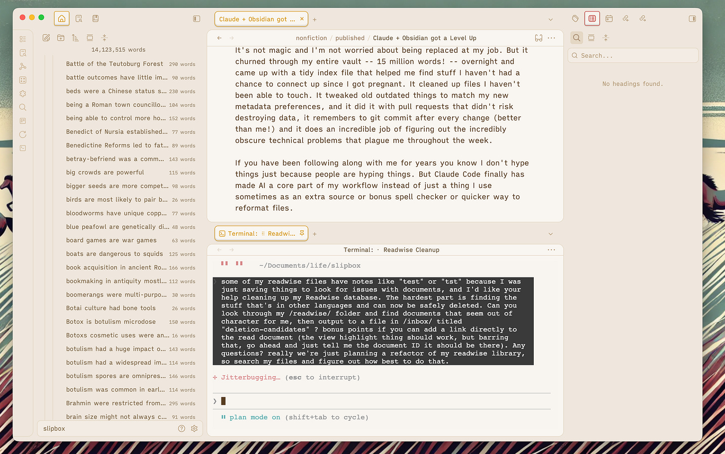 There’s a dedicated Claudian plugin (subtly different from the Claudsidian solution people), but the Terminal felt a little higher fidelity to how I’m used to doing things, and a little simpler to understand. Plus, Claudian looks great but honestly I don’t think I can live without plan mode, which the readme says it doesn’t currently support. Plan mode is nice because it asks questions, really thinks things through, and can be trusted not to do dumb destructive things.