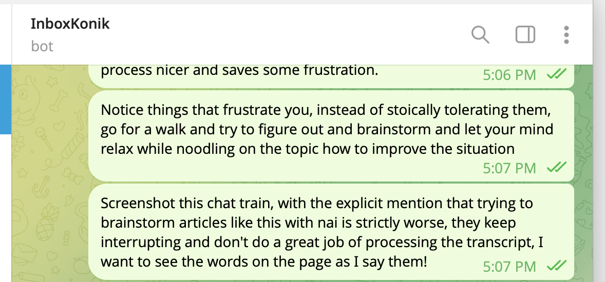 You can pry my em-dashes out of my cold dead hands and while yes I used AI to extract some of my words out of a Telegram HTML dump file because I didn’t realize my Telegram bot wouldn’t work on messages sent before I built the plugin, this article is all in my own words.