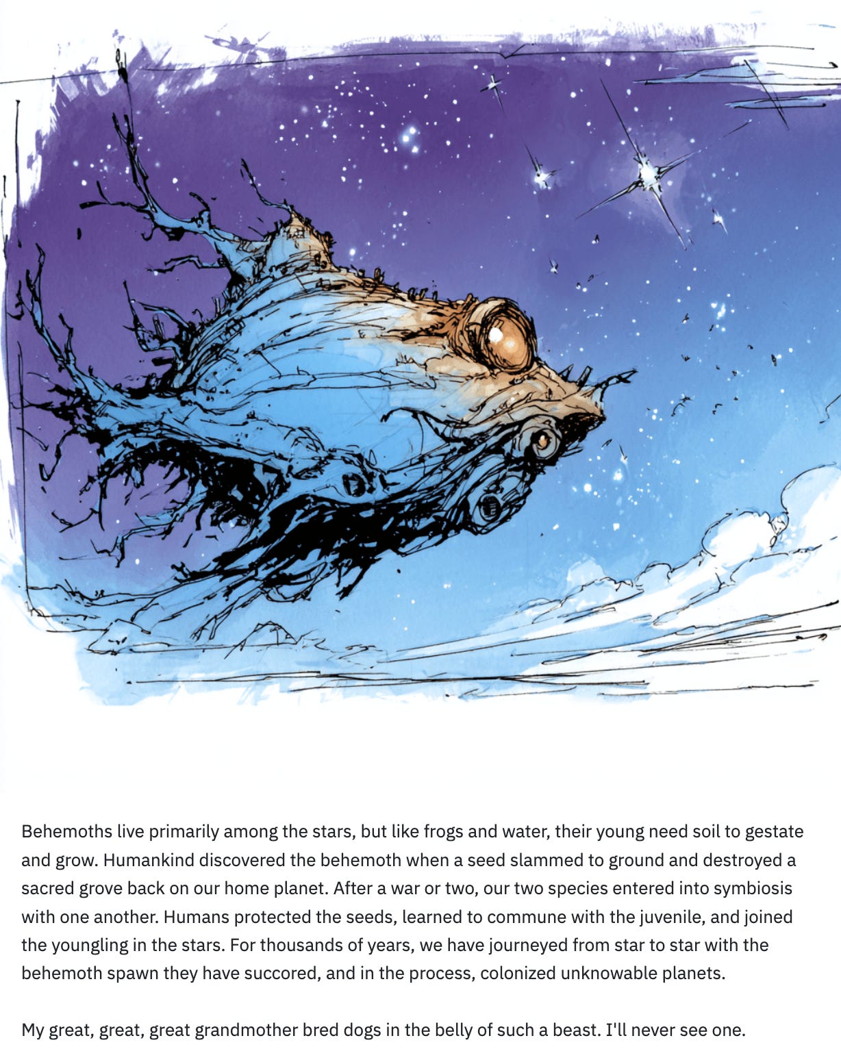 Chewing on worldbuilding questions is one of the primary ways I grapple with difficult questions; I believe very strongly in the value of sensemaking through fiction, although I am somewhat less enamored of New York Publishing and the Amazon distribution network than I used to be. The above segment about behemoths is inspired directly by the biblical behemoth, which I recently learned is sort of a mirror twin of the more famous leviathan from the Book of Job. But it also pulls in knowledge about amphibians I’ve been noodling on because my kids have a book with lots of frog pictures. It’s a reflection of my longstanding desire to write a colonization story, and the way my brain tries to reconcile science fiction and fantasy tropes while maintaining an internally consistent cosmos.